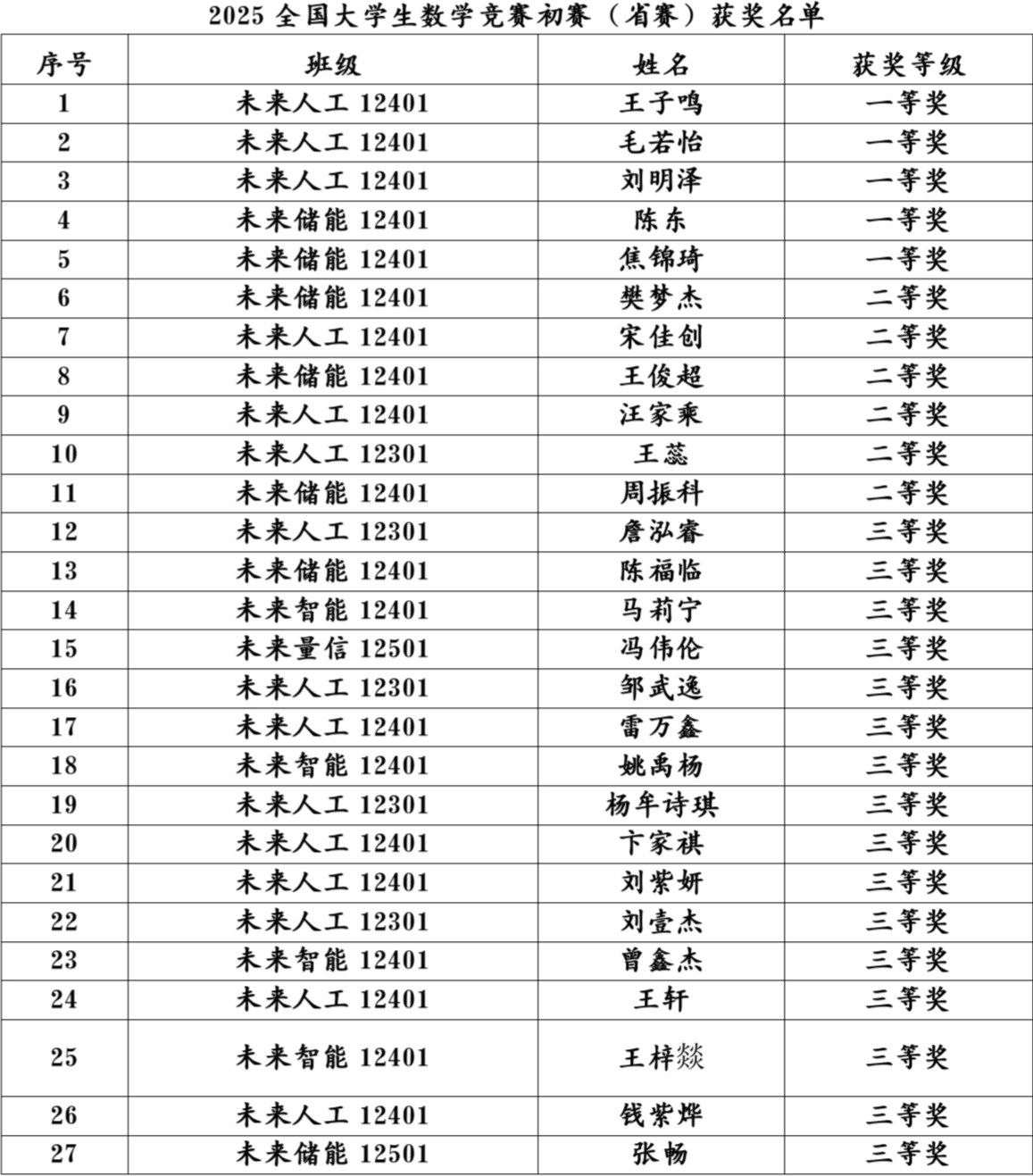 (通讯员 陆涵 向云彬)近日,2025年第十届全国老员工数学竞赛湖北区竞赛暨第十四届湖北省老员工数学竞赛初赛成绩公布,公司共有27名同学获奖,其中一等奖5人、二等奖6人、三等奖16人。未来人工12401班王子鸣同学以76.5分的全校最高分成功晋级全国决赛。本次省赛吸引全省2万余人参加,仅24人获得国赛资格,王子鸣是公司唯一入围选手。