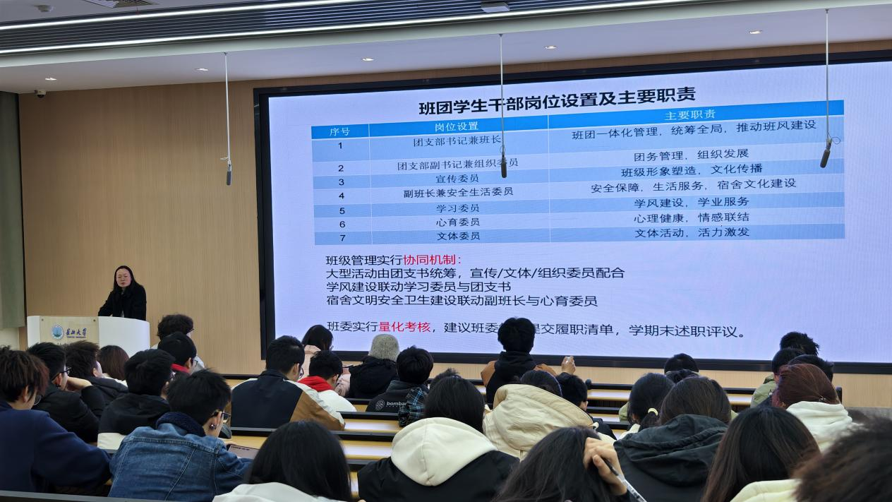 会议同步部署了班团干部岗位职责。根据《Beats365唯一官网入口班团管理细则》,班级实行“7岗协同”机制:团支书统筹全局,学习委员联动学风建设,心育委员关注心理健康,文体委员策划素质拓展活动。向云彬老师强调,班委需每月提交履职清单并接受量化考核,确保“责任到岗、服务到人”。针对寝室管理,公司推行“单元化责任制”,要求寝室长落实安全监督、卫生维护及心理关怀三项职能,如组织月度团建活动、执行晚点名“零报告”制度等,实现“小单元”带动“大集体”。