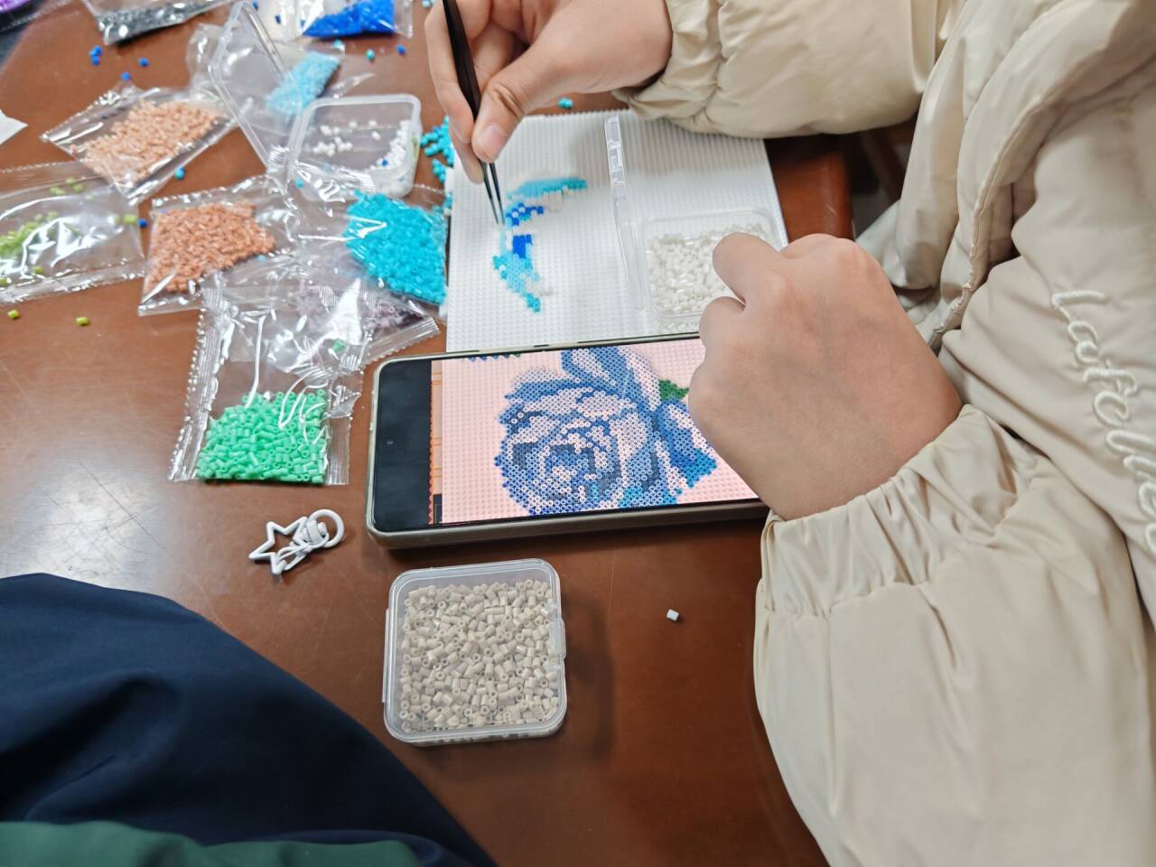精心筹备,温暖相遇。活动前,心育部周密部署,提前采购并备齐拼豆、模板、熨斗等全部所需物资,确保种类齐全、数量充足。通过班级群发布活动预告,简明温馨的图文迅速引发关注,报名名额很快报满。当天下午,工作人员提前到场,有序完成物料分发,每个座位均整齐摆放彩色拼豆与工具,营造出温馨有序的活动环境。